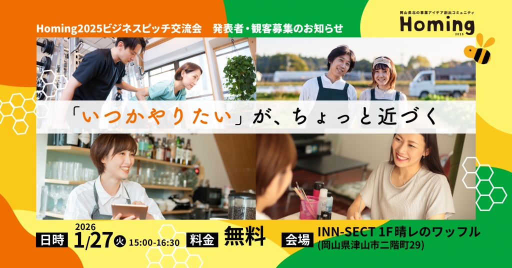 創業・新規事業支援『Homing(ホーミング)』 事業アイデア創出コミュニティ「Homing」第8期 Day4 を開催しました。 12月12日(金)の夜、岡山県北の事業アイデア創出コミュニティ「Homing」2025 Da… 2025.12.13